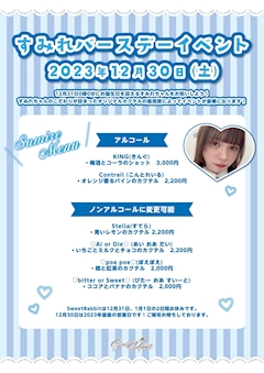 12月30日(土)すみれちゃんバースデーイベントです🩵 らむさんもこの日お手伝いさせてもらいます. ̫ . お祝いできるのはもちろん、BDEVはじめてだからとってもたのしみ☺️ みんなぜひすみれちゃんに直接おめでとうを伝えに来てください🍰✨ 30日は2023年スイラビ最後の営業日でもあるので 最後にメイドさん納めしに来てね🐰 みんなで最高のすみれちゃんバースデーにしようね🥰 本日も19:10〜25:00 居ます ご帰宅お待ちしております૮ . ̫ . ა ⸝꙳ らむ ♡ Sweet Rabbit ♡ ꒰ 住所 ꒱ 岐阜県岐阜市金町2-3 パールプラザビル1F ꒰ 営業時間 ꒱ 15:00〜LAST ꒰ 電話番号 ꒱ 058-266-7877 🐇岐阜メイドスイラビ
