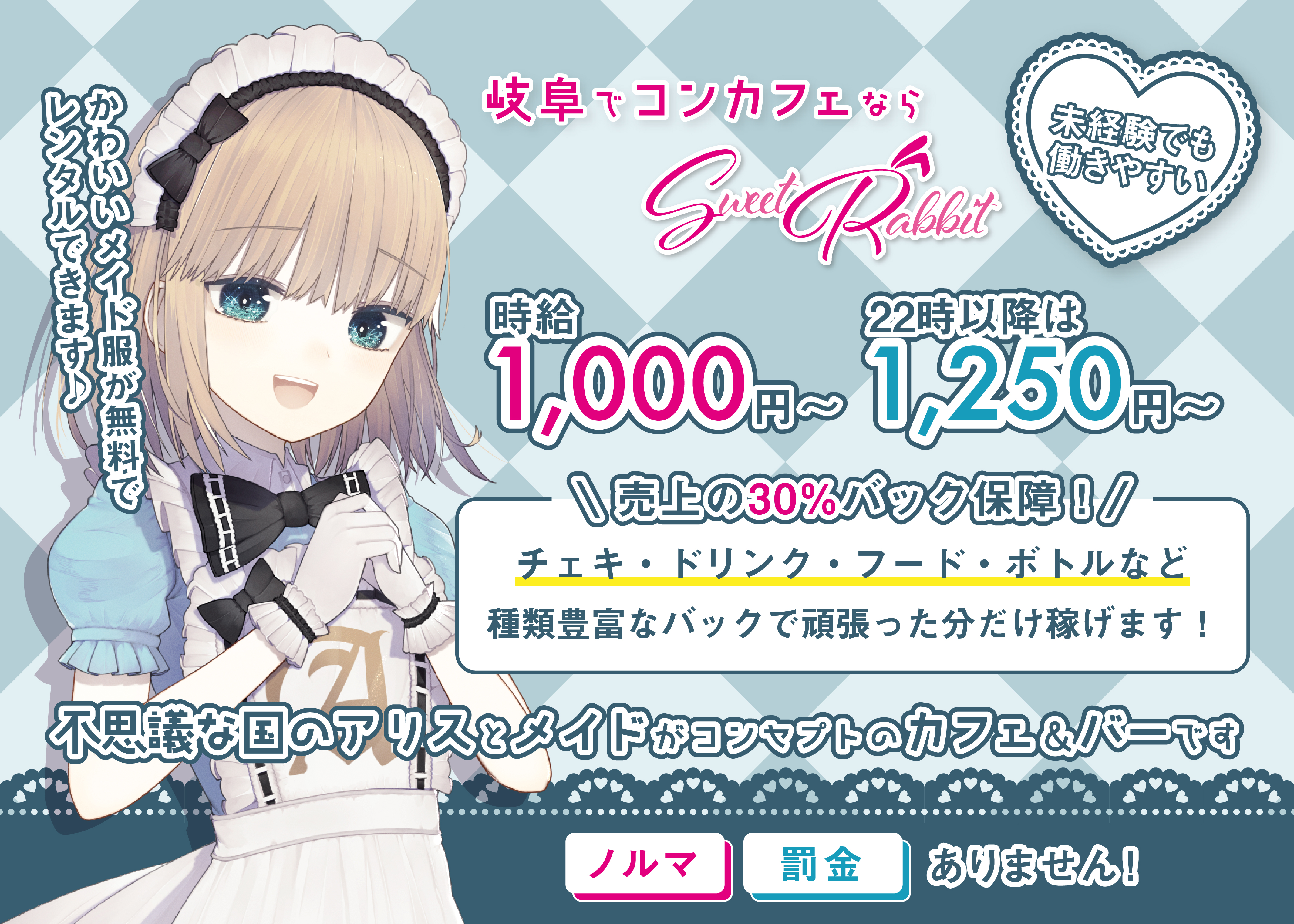 岐阜県唯一のメイドカフェ&バー「スイートラビット」は、不思議の国のアリスをテーマにしたコンセプトカフェです。柳ヶ瀬初のコンカフェで、癒しのひとときをお過ごしください。